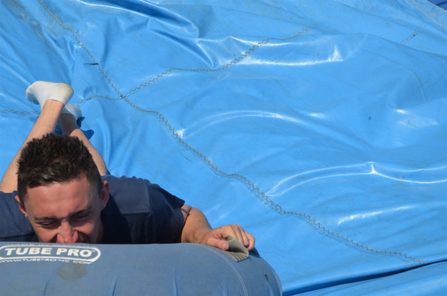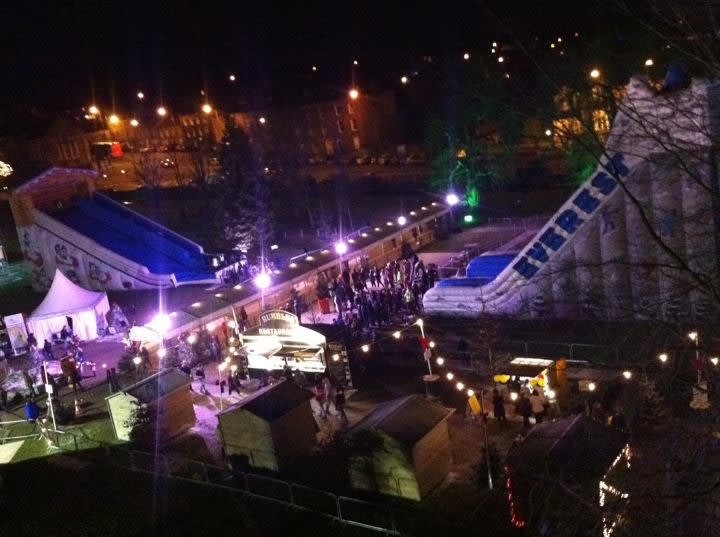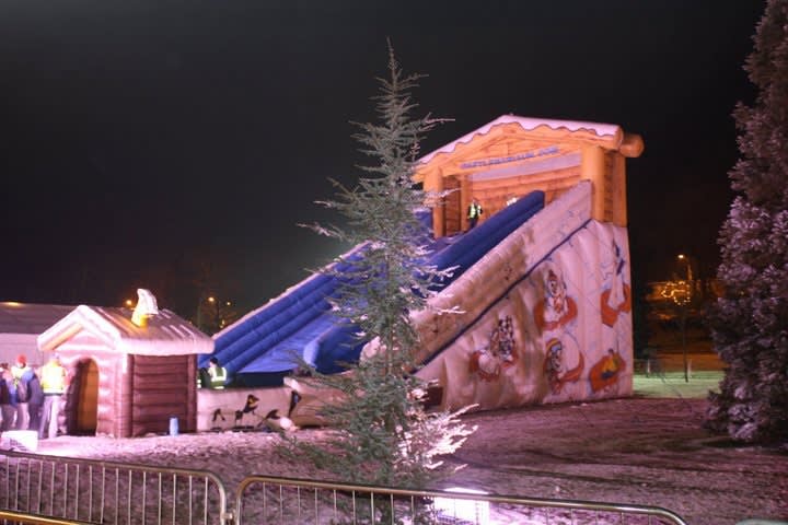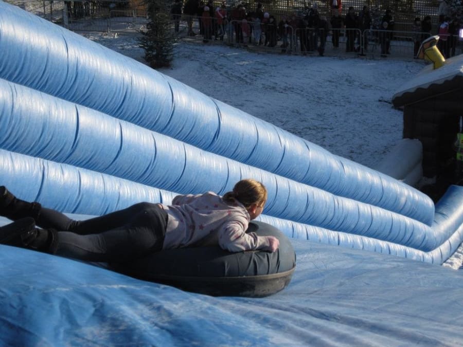 This giant inflatable slide has easy to climb steps and once at the top you grab your snow tube and down you slide spinning and gliding.